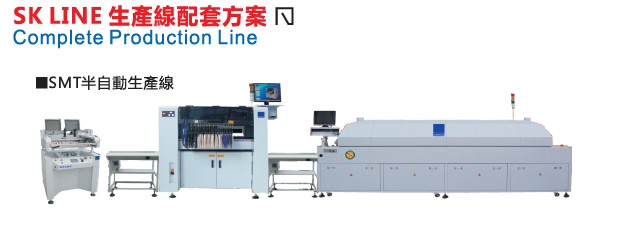 锡膏印刷机→接驳台→SMT多功能贴片机→接驳台→8温区无铅回流焊